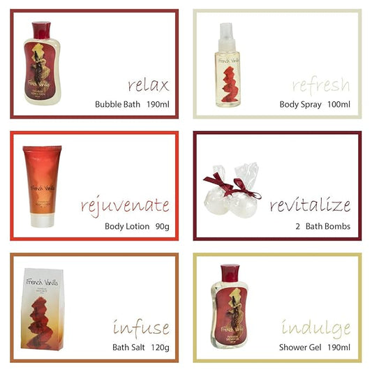 French Vanilla Bath Set Essential Bath and Body Basket: 2 Vanilla Bath Bombs, Body Lotion, Body Spray, Bath Salts, etc in a Wooden Jewelry Box
