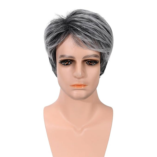 Short Wig for Men Layered Cut Wavy Fluffy Hair Wig with Bangs for Men Highlight Short Wig Natural Looking Synthetic Wigs for Daily Use Black Mix Grey (3571)