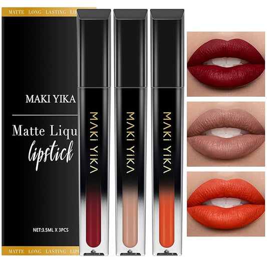 MAKI YIKA 3Pcs Matte Liquid Lipstick Makeup Set Dark Red Nude Orange Lipstick Long Lasting Smudgeproof Transfer Proof Lip Makeup, DarkRed/Nude/Orange