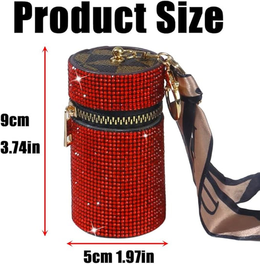 Bling Rhinestone Shiny Lipstick Case Keychain, Leather Diamond Lip Gloss Holder, Travel Lipstick Organizer for Purse Perfume Fingernail Polish (Red)