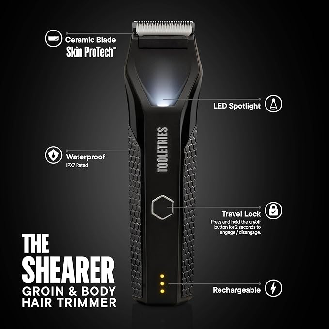 TOOLETRIES The Shearer - Groin & Body Hair Trimmer for Men, Electric Shaver for Pubic Hair, Balls, Groin, Chest, Legs, Waterproof Wet/Dry Clippers, Rechargeable, Bonus Shower Kit